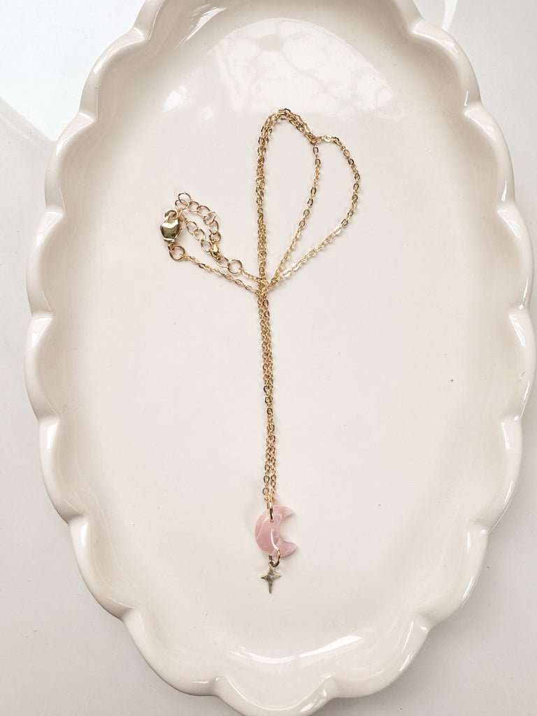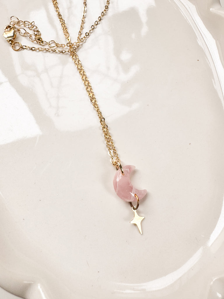 California | Crescent Moon and Polaris Necklace in Faux Rose Quartz